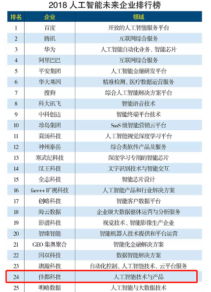 近日,由中国科学院《互联网周刊》、中国社会科学院信息化研究中心、eNet硅谷动力评选的“2018人工智能未来企业排行榜”出炉。佳都科技凭借人工智能的领先优势荣登榜单,彰显了佳都科技对于人工智能技术未来发展的前瞻性和行业应用的实力。
