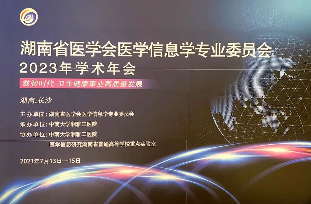 2023年7月13-15日,由湖南省医学会医学信息学专业委员会主办,中南大学湘雅三医院、中南大学湘雅二医院、医学信息研究湖南省普通高等学校重点实验室联合承办的“湖南省医学会医学信息学专业委员会2023年学术年会”在长沙顺利举办。