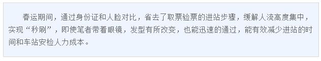 特别是在春运期间,通过身份证和人脸对比,省去了取票验票的进站步骤,缓解人流高度集中,实现“秒刷”,即使笔者带着眼镜,发型有所改变,也能迅速的通过,能有效减少进站的时间和车站安检人力成本。