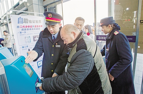 旅客需将二代身份证和蓝色车票叠放在一起,车票要放在身份证上方,车票正面的二维码要朝上、朝前,将身份证和车票一起放入闸机插入口,摄像头会采集旅客的人脸信息,与身份证人脸信息进行识别,如果一致的话,闸机就会打开,旅客就可以通过进站。