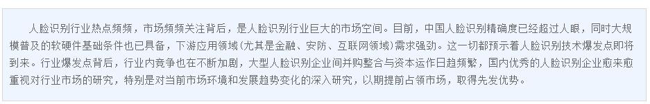 人脸识别行业热点频频,市场频频关注背后,是人脸识别行业巨大的市场空间。目前,中国人脸识别精确度已经超过人眼,同时大规模普及的软硬件基础条件也已具备,下游应用领域(尤其是金融、安防、互联网领域)需求强劲。这一切都预示着人脸识别技术爆发点即将到来。行业爆发点背后,行业内竞争也在不断加剧,大型人脸识别企业间并购整合与资本运作日趋频繁,国内优秀的人脸识别企业愈来愈重视对行业市场的研究,特别是对当前市场环境和发展趋势变化的深入研究,以期提前占领市场,取得先发优势。
