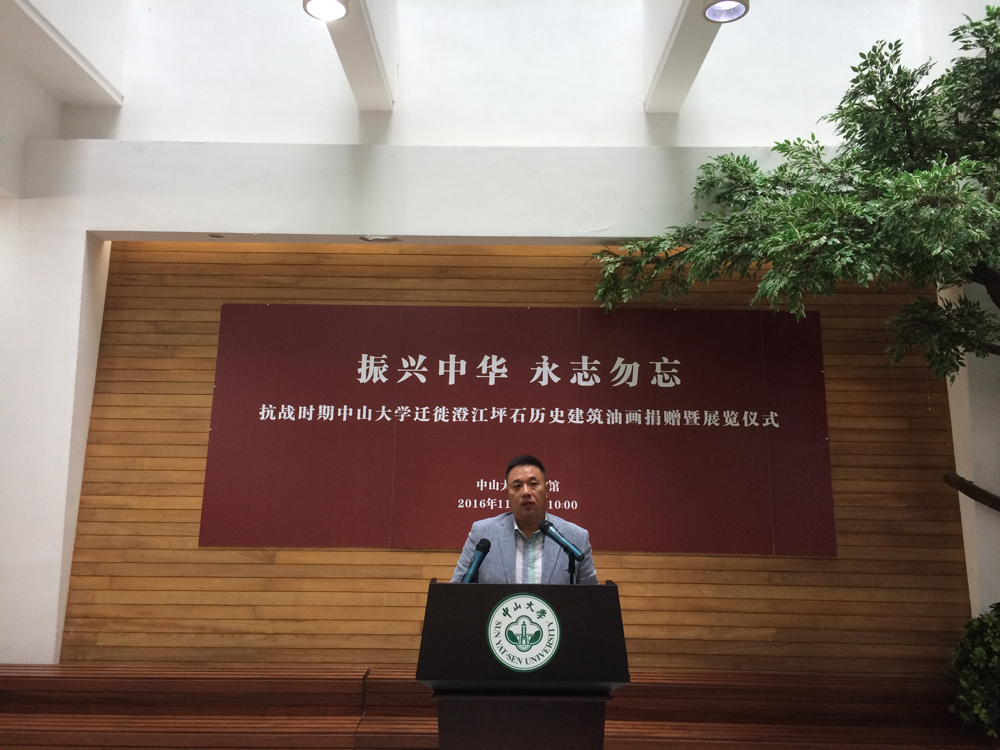 11月10日上午,“振兴中华、永志勿忘——抗战时期国立中山大学迁徙澄江坪石历史建筑油画捐赠暨展览仪式“在中大图书馆举行。中大校友、广州佳都集团董事长刘伟出席了仪式并致辞。刘伟先生慷慨捐资百万元购买此系列画作共60幅赠予中山大学。