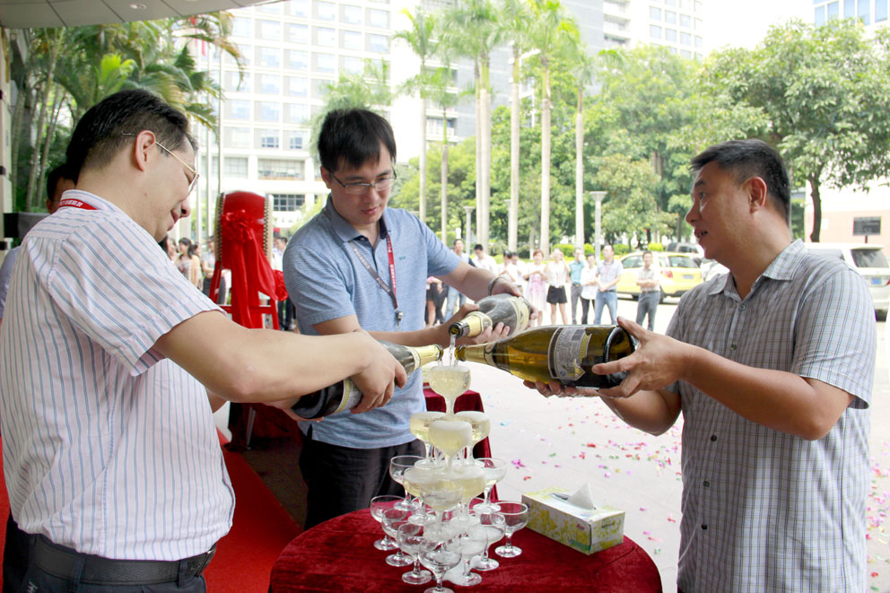 pa旗舰厅:在庆功典礼上,董事长刘伟,副总裁顾友良,助理总裁、智能安防(广东)事业部总经理刘斌共同开启香槟庆祝